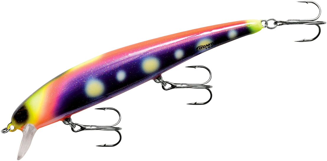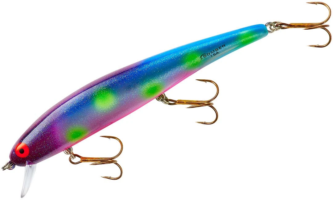 | Bomber Long A B14A | 3 1/2 in | 3/8 oz | 2x #6 | Crank: 2 ft, Troll: 5 ft | Jerkbait for Largemouth, Smallmouth, Striper, Trolling and Crankbait for Walleye, Pike. |